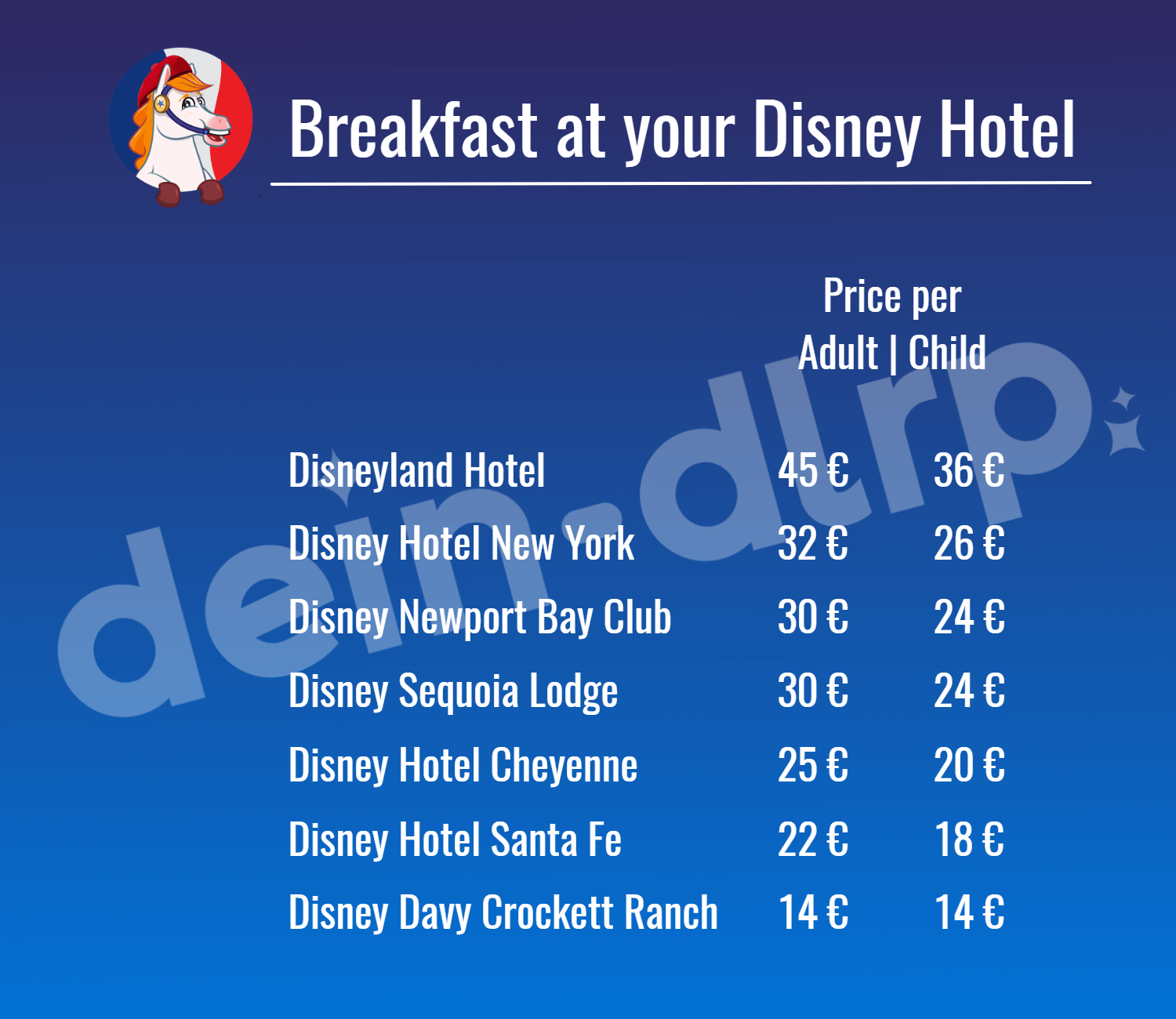 If you have booked a non-Disney hotel, please check your booking documents to see whether breakfast is included or if you have booked a stay without "petit déjeuner" (French for breakfast). If the option is not included, you can book this offer at the check-in in most hotels. Depending on the hotel category, you will usually be charged between € 8-20. You can either find the cost on the website of the respective hotel or ask for it at check-in.